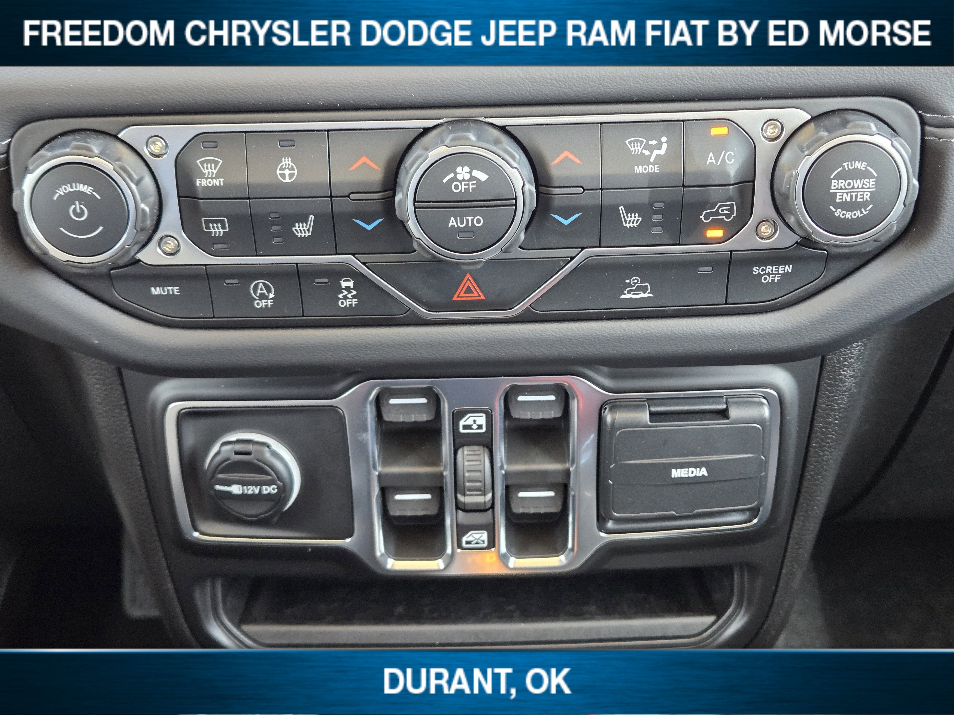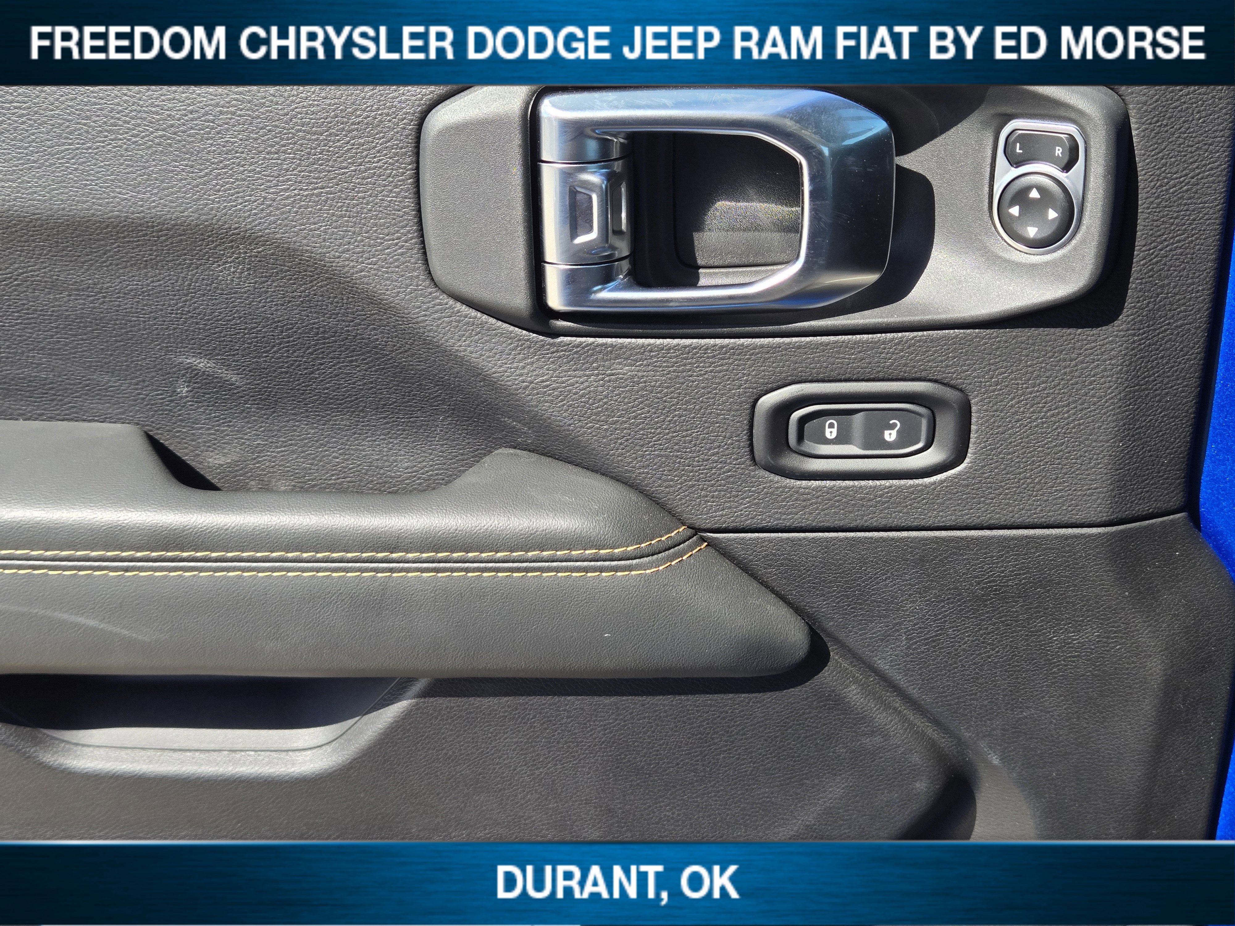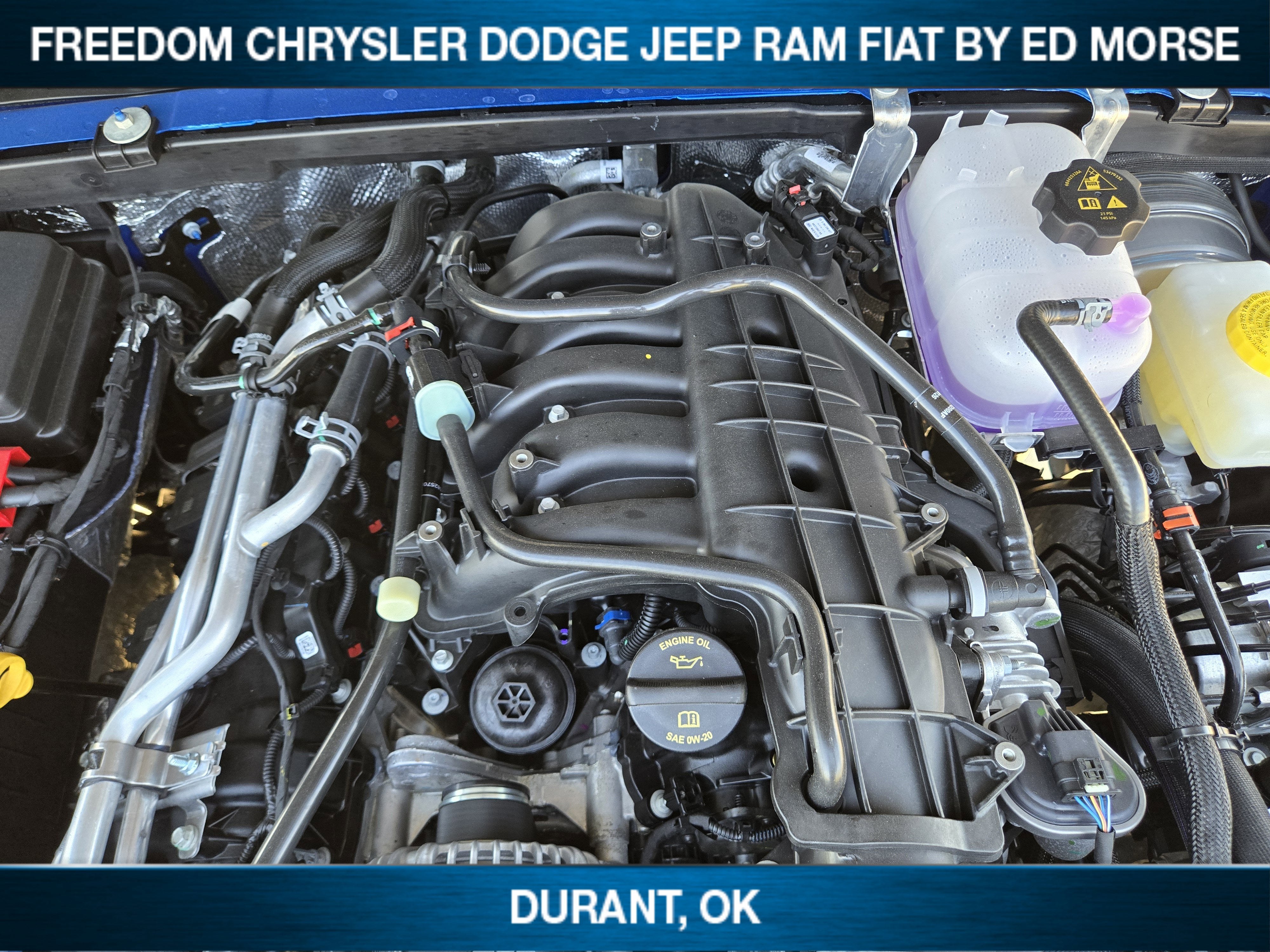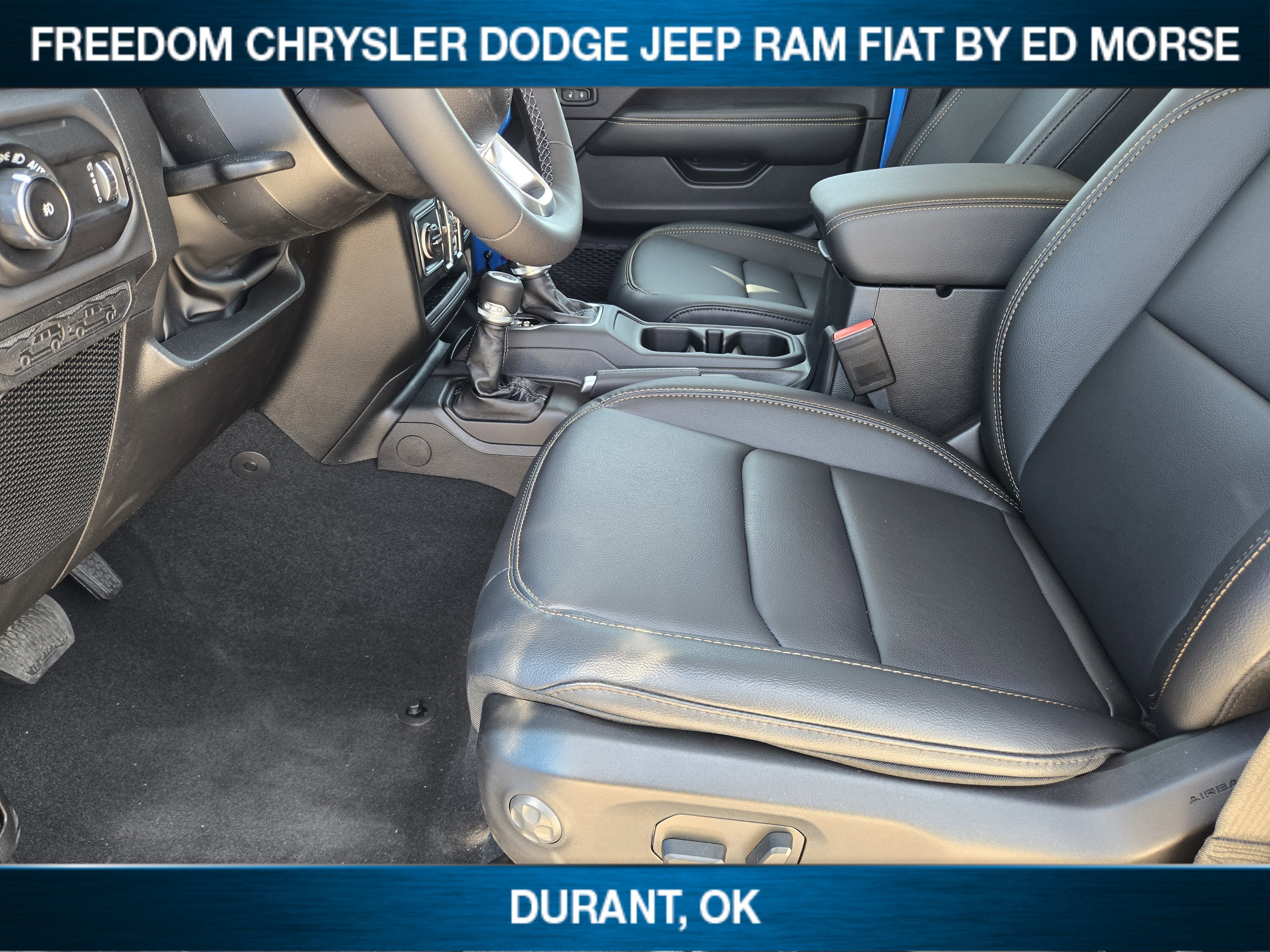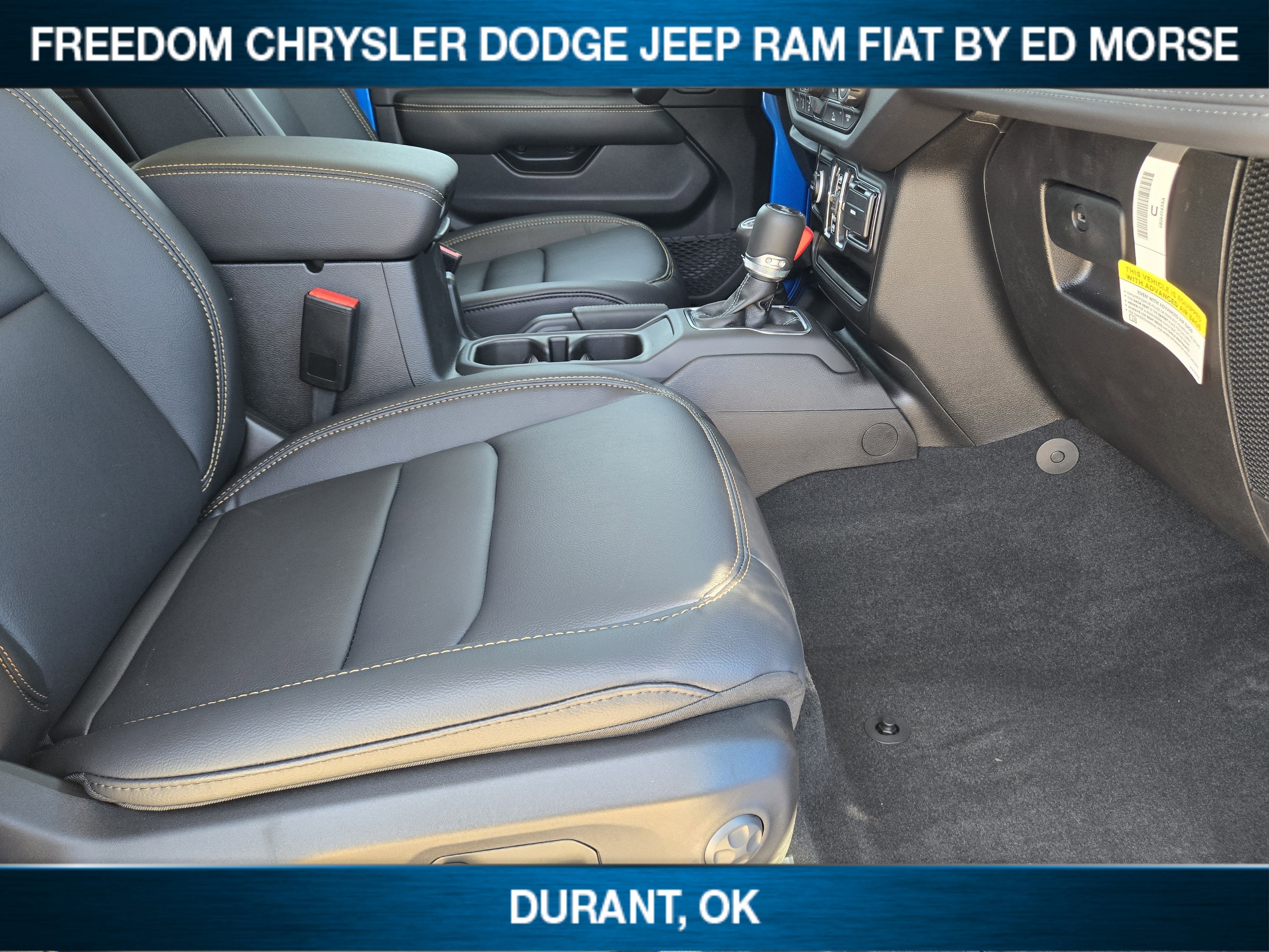 Hydro Blue Pearl Coat 2026 Jeep Wrangler Sahara 4WD 8-Speed Automatic 3.6L V6 24V VVT CLEAN AND SANITIZED.Live in Texas NO PROBLEM! We have no added taxes or fees for you Texans! We just want to save you money on your next new ride!Freedom Chrysler Dodge Jeep Ram FIAT Durant- Just a few minutes north of the Texas border in Southern Oklahoma is a family owned company that has been in the business for decades. Our experienced sales staff can point you in the right direction based on your individual vehicle needs. We also offer competitive financing, top tier service and a fully stocked inventory. We're defining how our customers buy and own vehicles and it's working. Simply put, you will appreciate the easiest, most efficient and enjoyable buying experience anywhere! Come see us or call @ 580-924-7500 or visit us online @ www.freedomchrylserdodgejeepramfiat.com Save At FreedomQuick Order Package 24G, Technology Group (12.3 Touchscreen Display, 4G LTE Wi-Fi Hot Spot, Apple CarPlay, Auto-Dimming Rear-View Mirror, Connected Travel and Traffic Services, Connectivity - US/Canada, For More Info, Call 800-643-2112, Google Android Auto, GPS Navigation, HD Radio, Integrated Center Stack Radio, Integrated Off-Road Camera, Integrated Voice Command with Bluetooth®, Radio: Uconnect 5 Navigation with 12.3 Display, SiriusXM Radio Service, SiriusXM with 360L, and Universal Garage Door Opener), Whitecap Package (1941 Side Decals, Freedom Panel Storage Bag, Rear Window Defroster, Rear Window Wiper/Washer, White 3-Piece Hard Top, and White Grille with Platinum Silver Rings), 3.45 Overall Top Gear Ratio, 4-Wheel Disc Brakes, 8 Speakers, ABS brakes, Air Conditioning, Alloy wheels, Alpine Premium Audio System, AM/FM radio: SiriusXM with 360L, Apple CarPlay/Android Auto, Automatic temperature control, Aux Battery, Brake assist, Cloth Low-Back Bucket Seats, Compass, Delay-off headlights, Driver door bin, Driver vanity mirror, Dual front impact airbags, Dual front side impact airbags, Electronic Stability Control, Emergency communication system: Jeep Connect, Front anti-roll bar, Front Bucket Seats, Front Center Armrest w/Storage, Front dual zone A/C, Front fog lights, Front reading lights, Fully automatic headlights, Heated door mirrors, Heated front seats, Heated steering wheel, Heavy Duty Suspension with Gas Shocks, Illuminated entry, Integrated roll-over protection, Jeep Trail Rated Kit, Low tire pressure warning, MOPAR All-Weather Floor Mats, Myflexcare Service Plan, Non-Lock Fuel Cap Without Discriminator, Occupant sensing airbag, Outside temperature display, Overhead airbag, Panic alarm, ParkView Rear Back-Up Camera, Passenger door bin, Passenger vanity mirror, Power door mirrors, Power steering, Power windows, Radio data system, Radio: Uconnect 5 with 12.3 Display, Rear anti-roll bar, Rear reading lights, Remote keyless entry, Security system, Side Steps, Speed control, Split folding rear seat, Steering wheel mounted audio controls, Stop-Start Dual Battery System, Tachometer, Telescoping steering wheel, Tilt steering wheel, Traction control, Trip computer, Variably intermittent wipers, Voltmeter, and Wheels: 18 x 7.5 Machine/Painted GraY. All prices are plus TT&L. Some customers may not qualify for all rebates, please see dealer for details. Price includes: $1000 - 2026 National Retail Bonus Cash . Exp. 04/30/2026